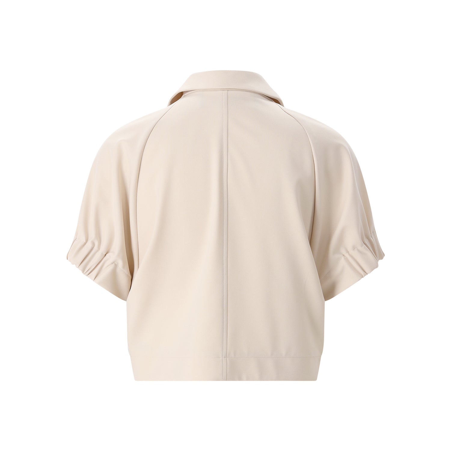 Diese Jacke ist ein Paradebeispiel für zeitlose Eleganz mit einem modernen Twist. Sie besticht durch ihre klare, fast skulpturale Silhouette. Das modische Highlight ist der asymmetrische Reißverschluss, der dem klassischen Design eine avantgardistische Note verleiht. Dank der verkürzten Länge und der kurzen Ärmel eignet sich dieses Piece perfekt für anspruchsvolle Layering-Looks oder als eleganter Solist an warmen Tagen.