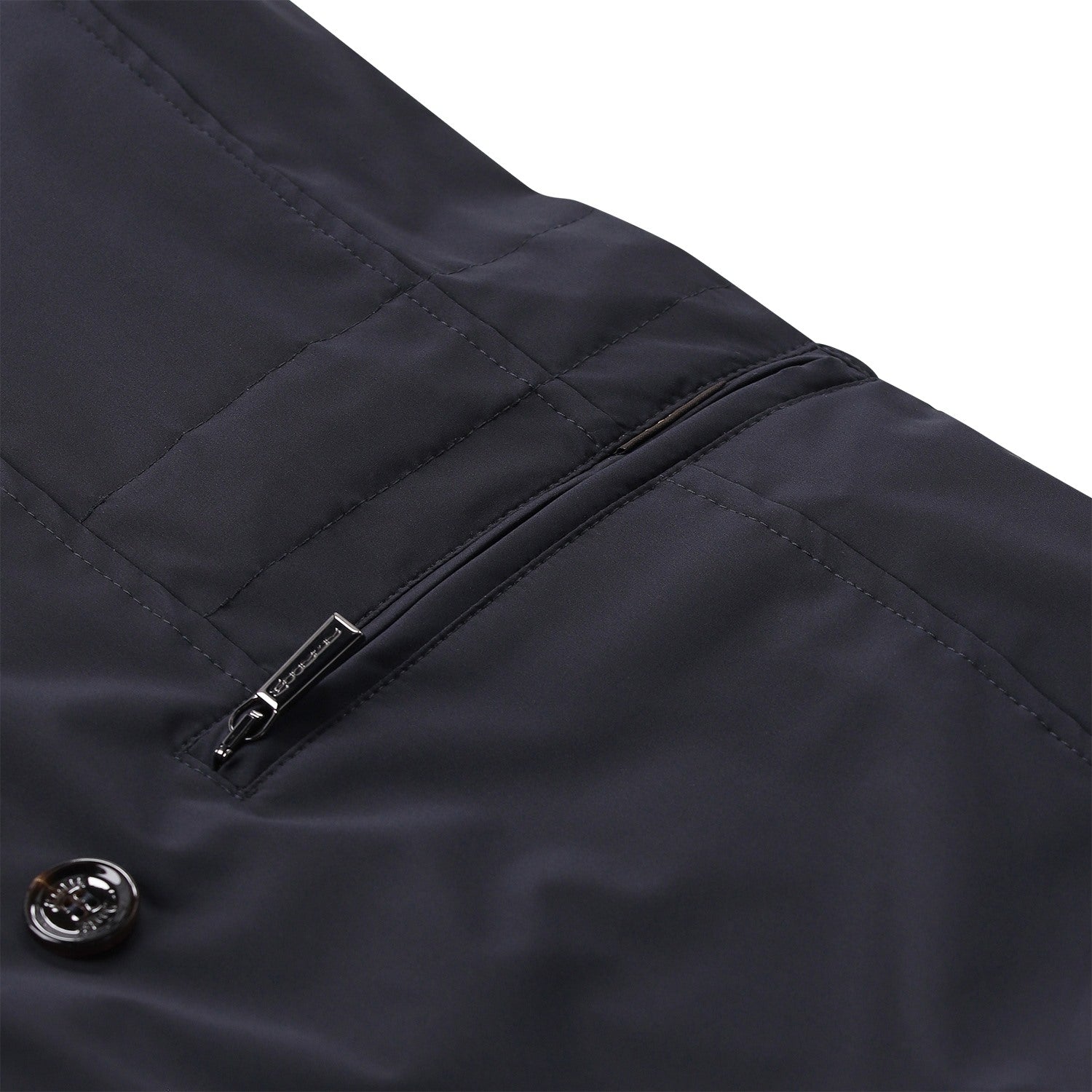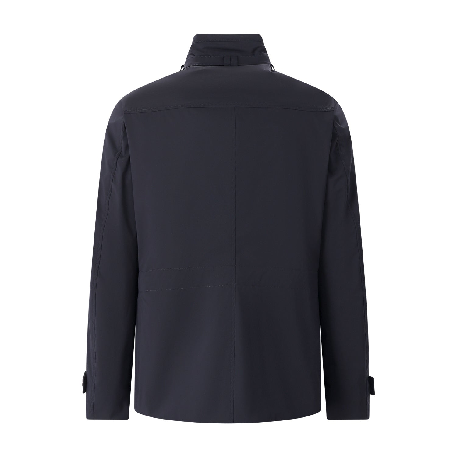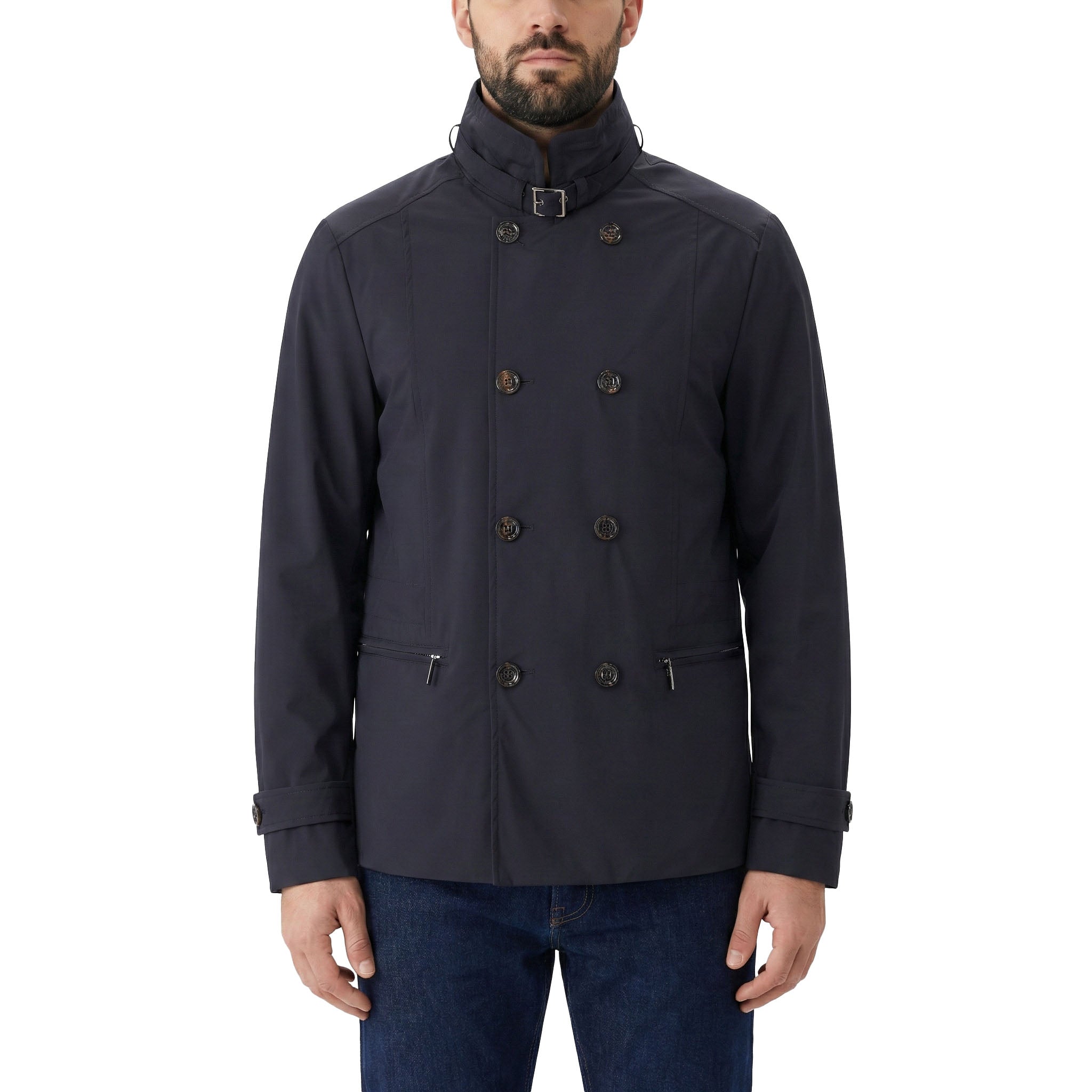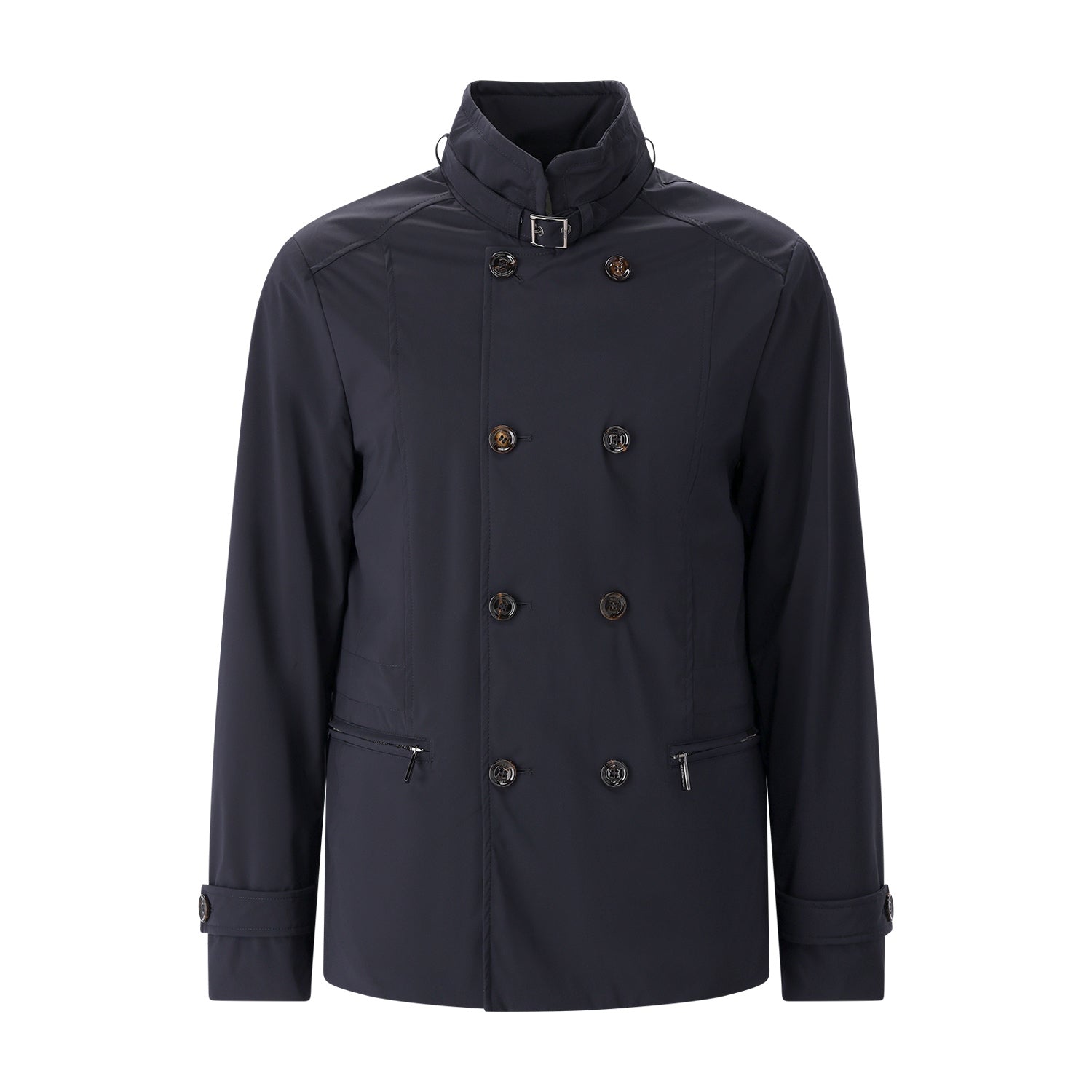Dieser in Italien gefertigte Kurzmantel vereint exklusive Materialien mit modernem Wetterschutz. Ein edler Seidenanteil verleiht dem Stoff einen dezenten Glanz, während die wasserabweisende Oberfläche für höchste Alltagstauglichkeit sorgt. Besondere Akzente setzen der markante Stehkragen mit Schnallen-Detail und die elegante Kombination aus Zwei-Wege-Reißverschluss und doppelreihiger Knopfleiste. Für eine individuelle Silhouette lässt sich die Weite durch einen innenliegenden Tunnelzug flexibel anpassen.