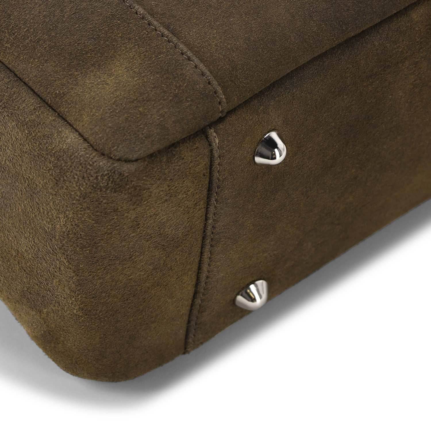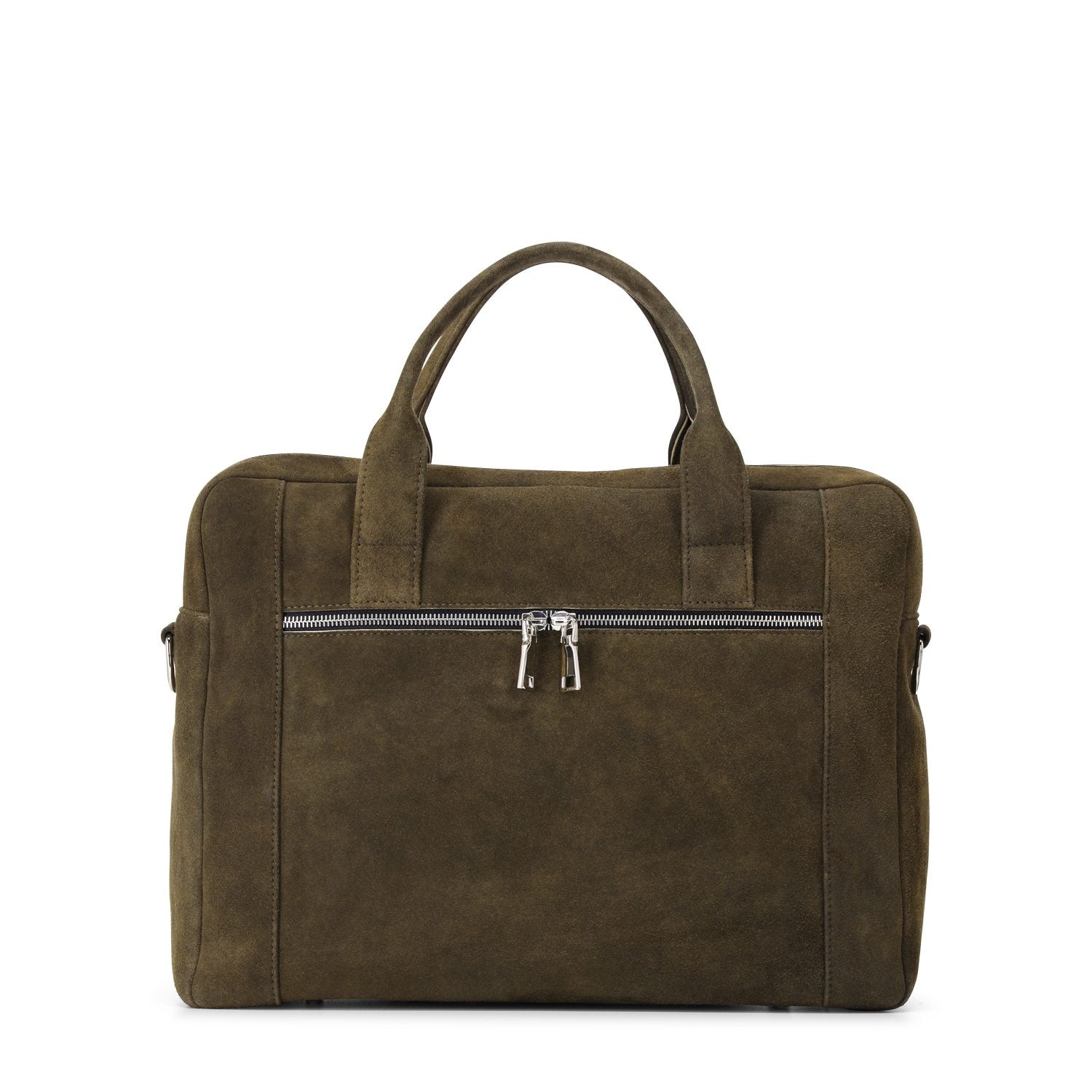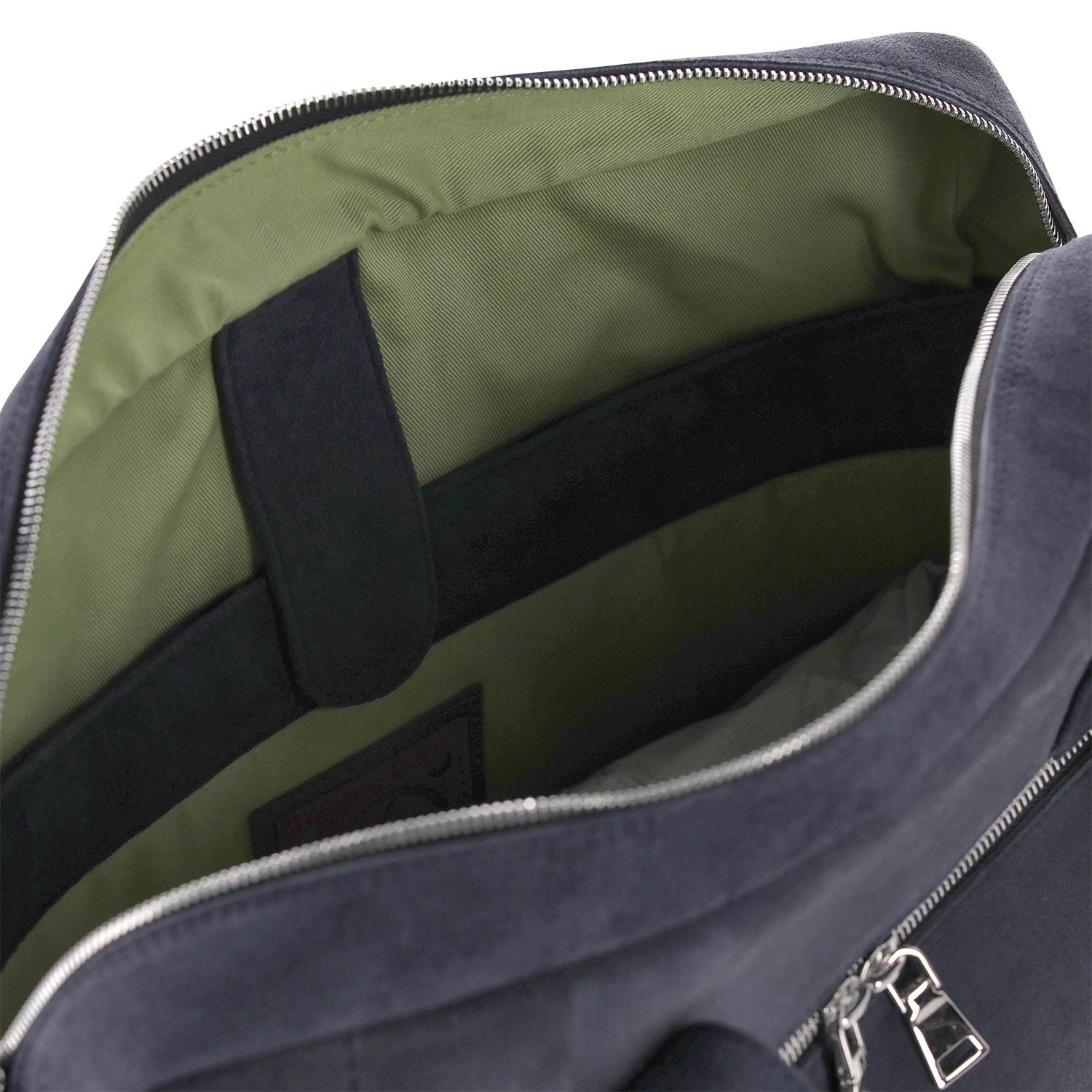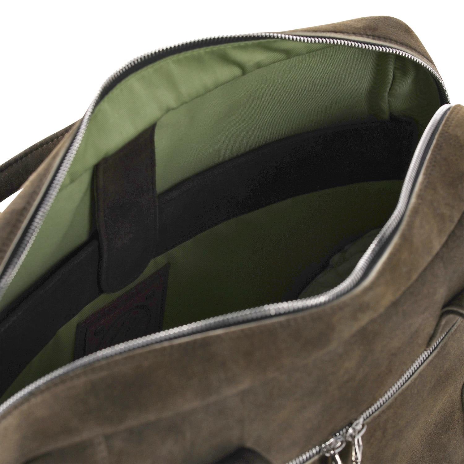 Diese handgefertigte Businesstasche aus hochwertigem Ziegenveloursleder vereint edles Design mit funktionaler Raffinesse. Mit robustem, grünem Canvas-Futter bietet sie ausreichend Platz für einen 16-Zoll-Laptop, Ordner und wichtige Unterlagen. Das durchdachte Innenleben mit mehreren Fächern, darunter separate Taschen für Telefon und Reisepass, sorgt für optimale Organisation. Außen punktet die Tasche mit einer großen Reißverschlusstasche, robusten, abgenähten Ledergriffen, einem abnehmbaren Schultergurt und Bodennieten für zusätzliche Stabilität.