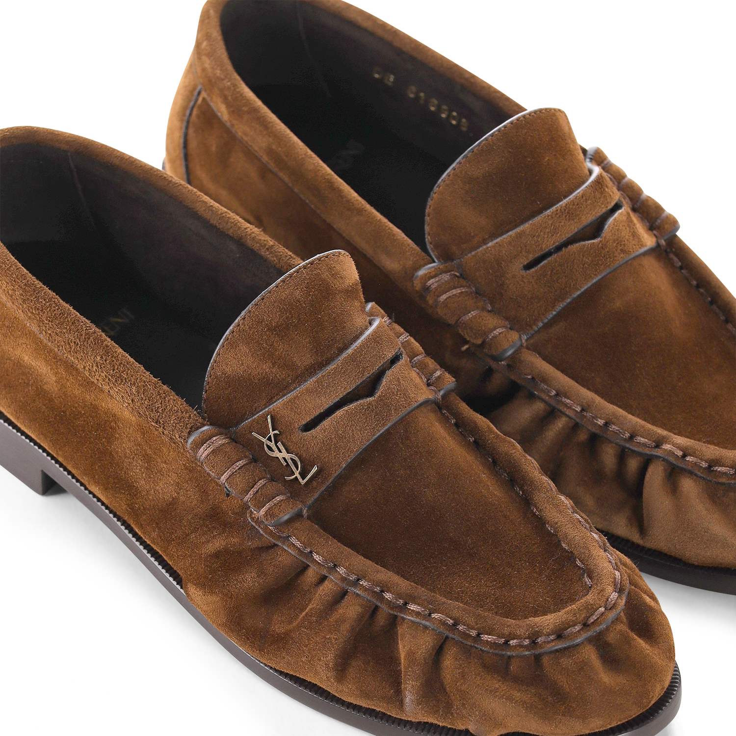 Dieser in Italien gefertigte Loafer besticht durch sein geschmeidiges Veloursleder und eine anspruchsvolle Verarbeitung. Die charakteristische, handgenähte Moc-Toe-Zehenpartie verleiht dem Modell eine klassische Struktur, während die markante Cassandre Brosche aus goldfarbenem Metall einen luxuriösen Akzent setzt. Eine flache Ledersohle mit dezentem Absatz vervollständigt das elegante Design und sorgt für ein erstklassiges Tragegefühl.