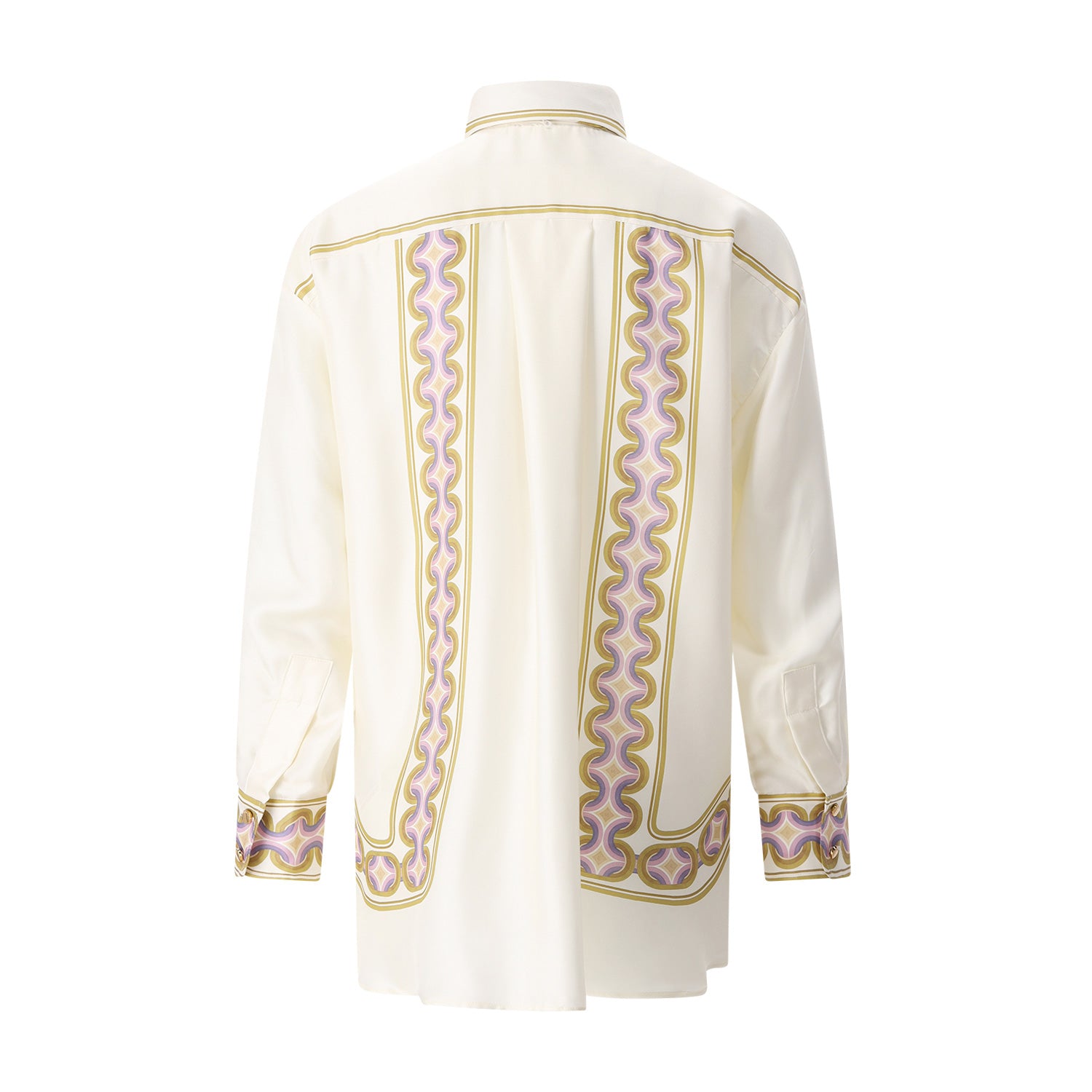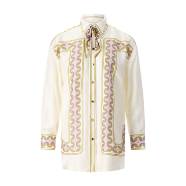 Erleben Sie puren Luxus auf der Haut mit dieser exquisiten Hemdbluse aus fließender Seide. Die lockere Passform umspielt sanft die Silhouette, während der besondere Print für einen künstlerischen und individuellen Auftritt sorgt. Ein besonderes Highlight ist der elegante Kragen mit integriertem Tuch, das sich variabel stylen lässt, ergänzt durch eine klassische, durchgehende Knopfleiste.