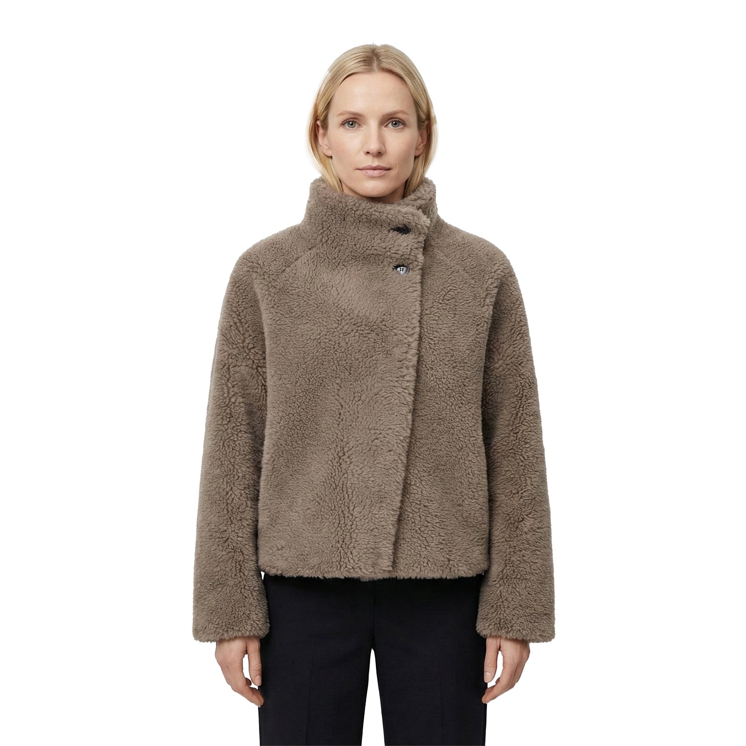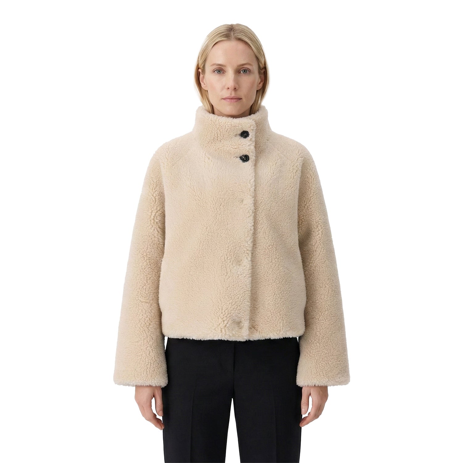 Die wendbare Teddy-Wolljacke im Oversized-Fit vereint Komfort und Style in einem. Der weiche, flauschige Stoff, der hochschließbare Stehkragen mit markanten Knöpfen und praktische Seitentaschen machen die Jacke zum vielseitigen Begleiter, der jedes Outfit im Handumdrehen aufwertet.