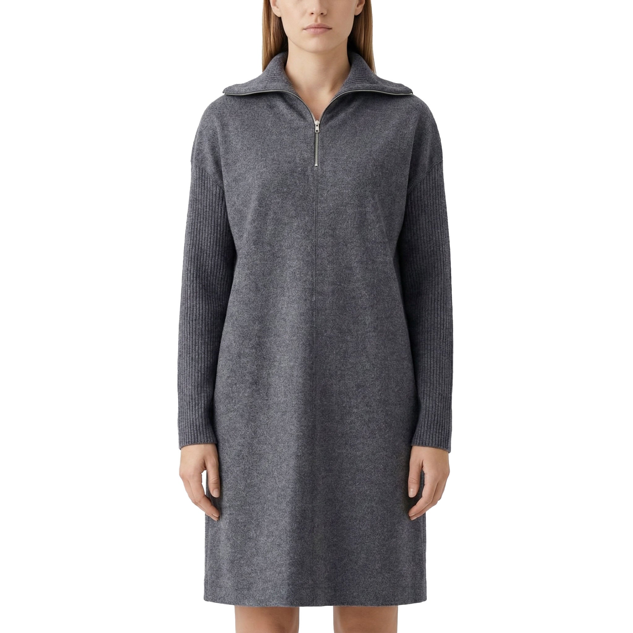 Dieses Midikleid aus feiner Wolle vereint zeitlose Eleganz mit modernem Design. Hergestellt in Italien, besticht es durch einen stilvollen Reißverschluss am Kragen und Strickärmel, die für eine besondere Textur und hohen Tragekomfort sorgen.