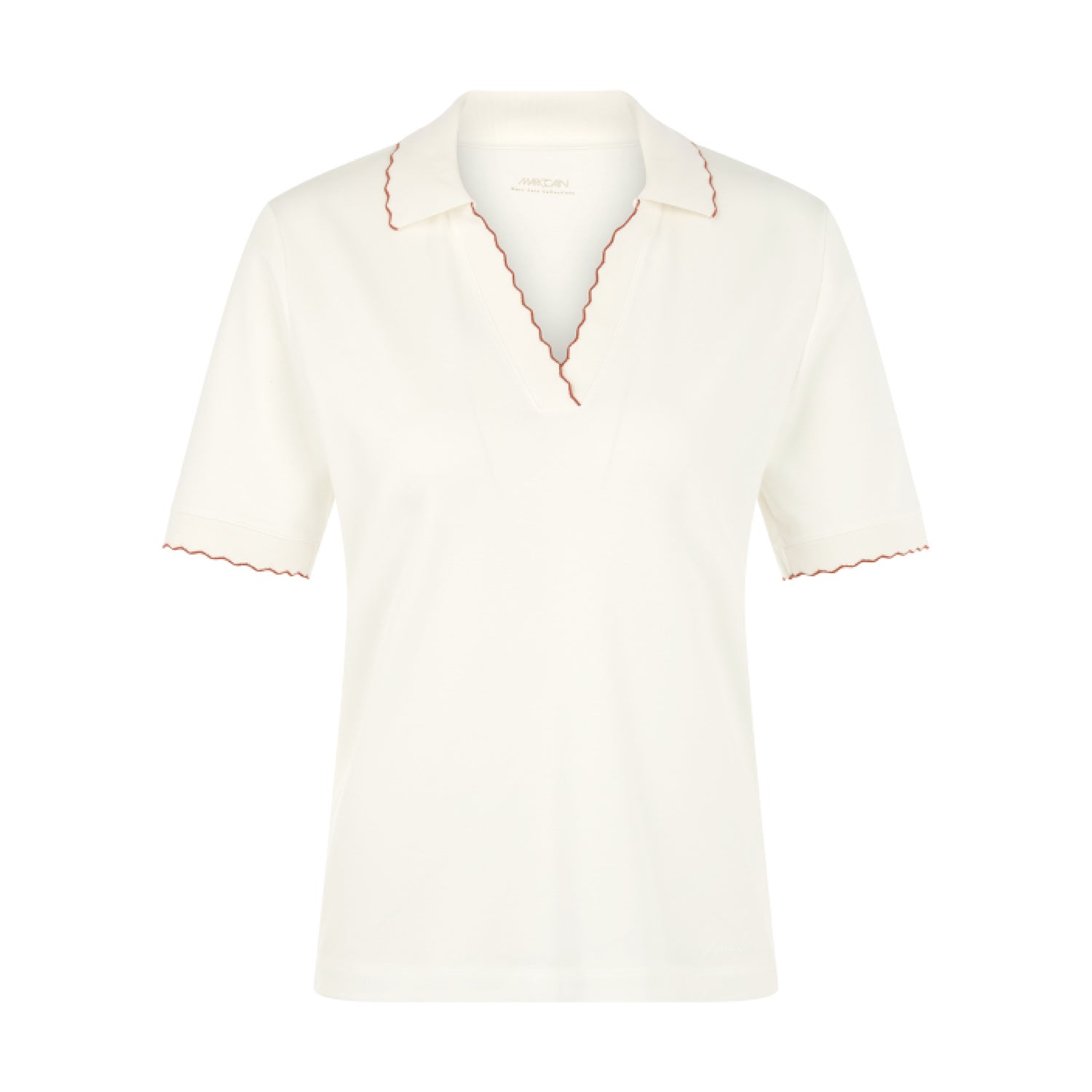 Dieses Poloshirt ist aus besonders weichem Baumwollmix gefertigt. Es schmiegt sich sanft an die Figur an und sorgt durch die leichte Taillierung für eine wunderschöne, feminine Silhouette. Der klassische Kragen am eleganten V-Ausschnitt sowie die Ärmelabschlüsse sind mit einer wellig gearbeiteten Kontrastnaht.