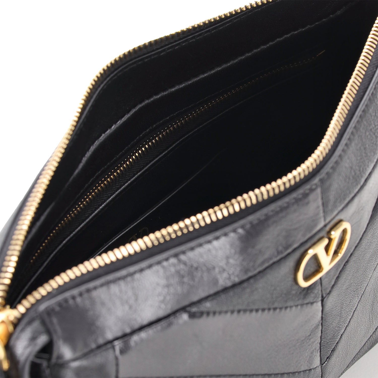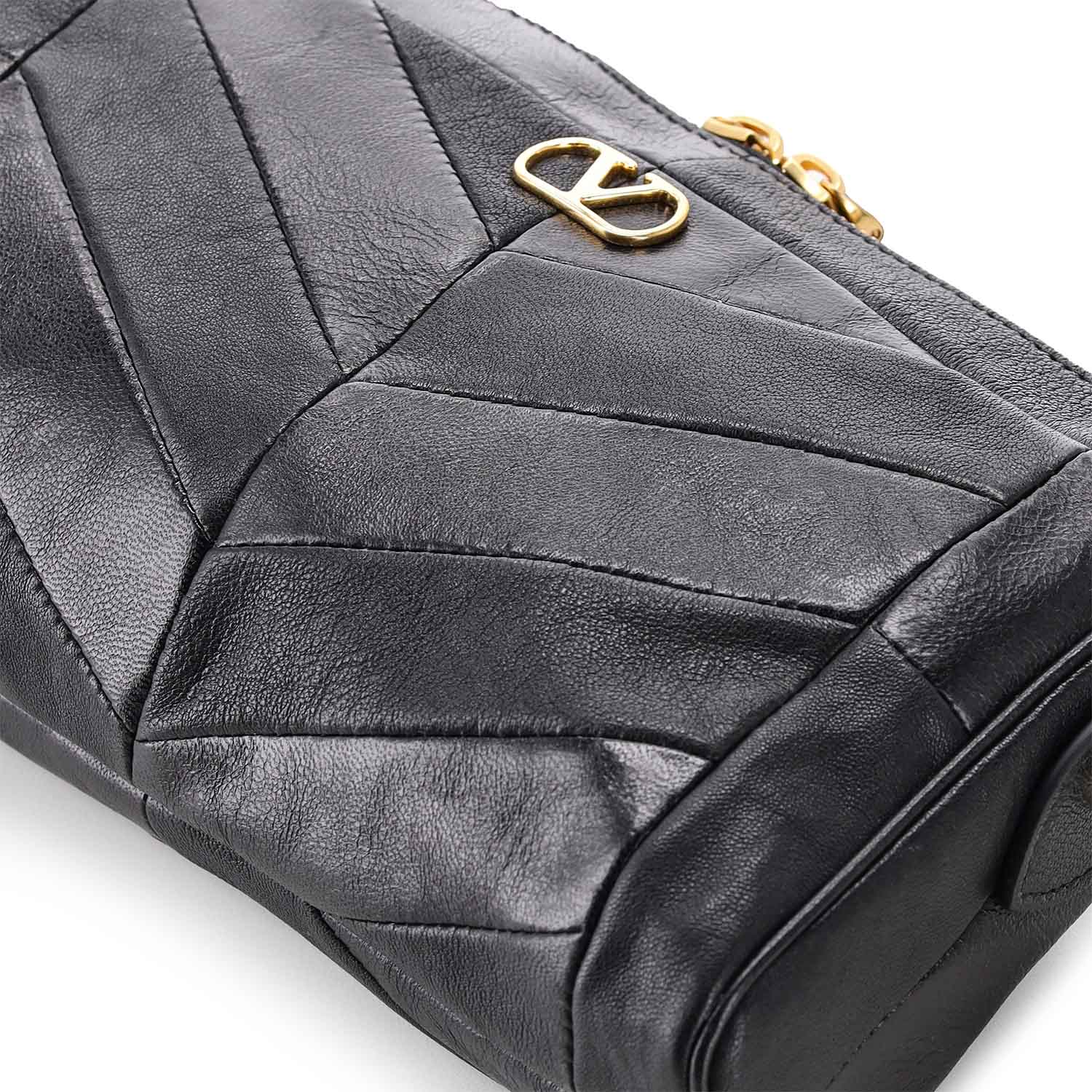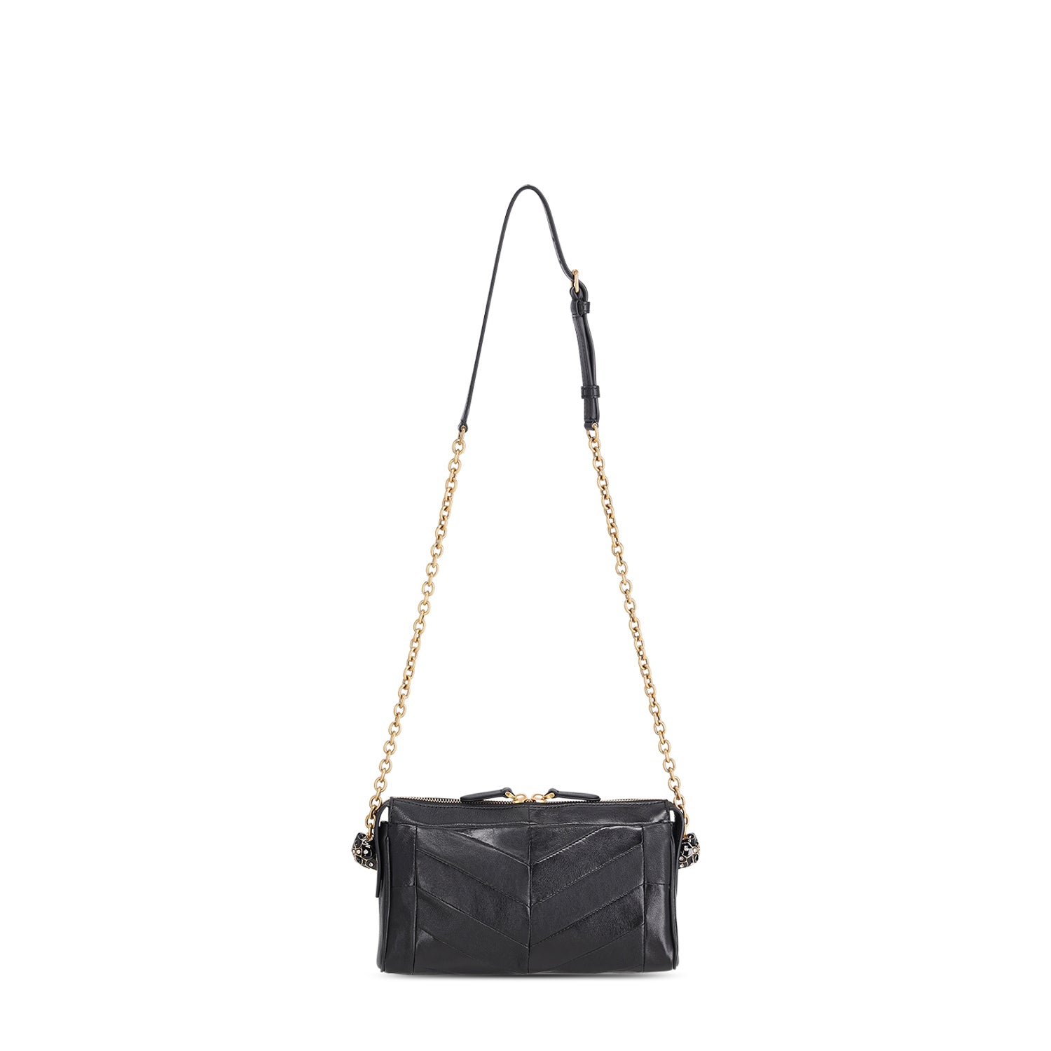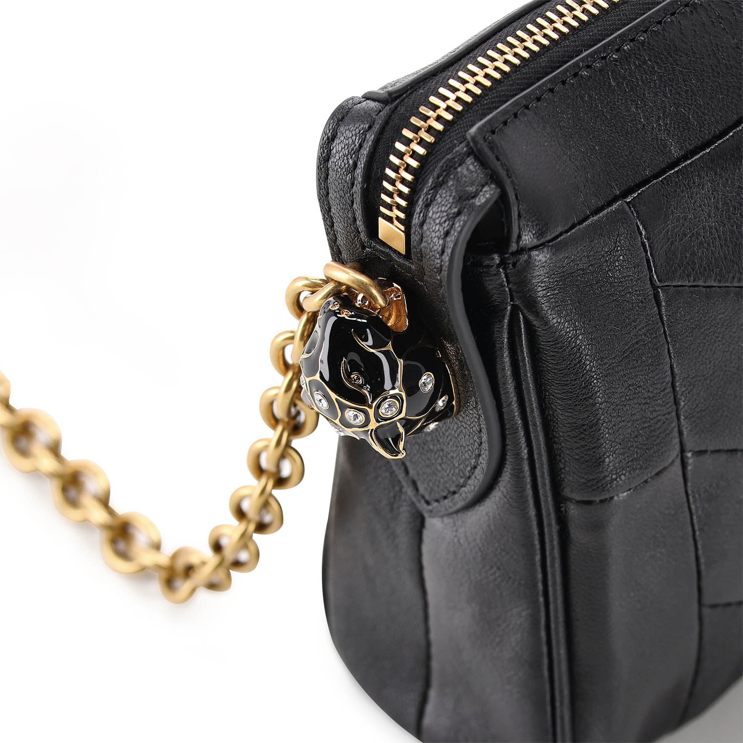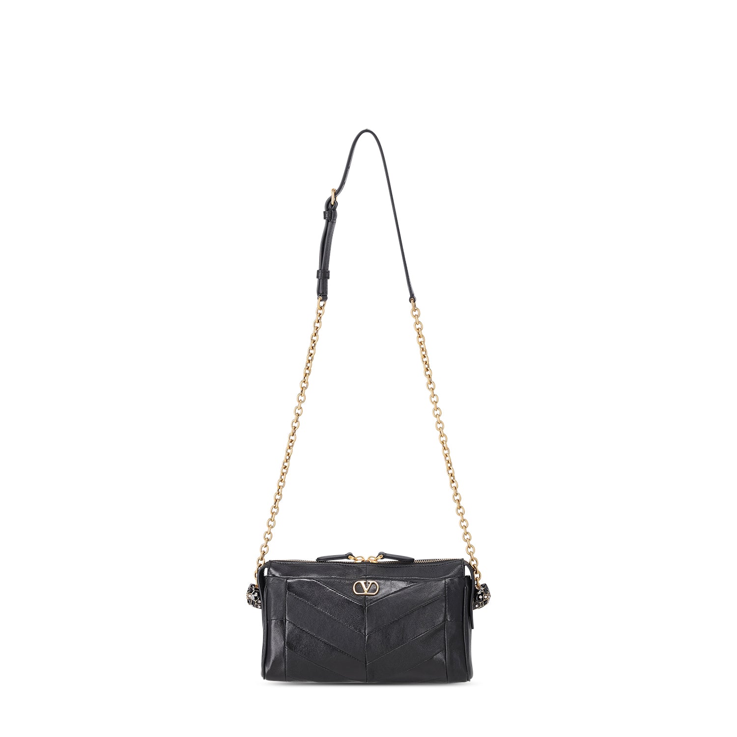 Die kleine Panthea Tasche ist ein handwerkliches Meisterstück aus dem Hause Valentino. Sie besticht durch ein raffiniertes Patchwork-Design, das glänzendes und mattes Nappaleder in einem eleganten Chevron-Muster vereint. Ein exklusives Highlight sind die emaillierten Katzenköpfe, die mit funkelnden Swarovski®-Kristallen besetzt sind.