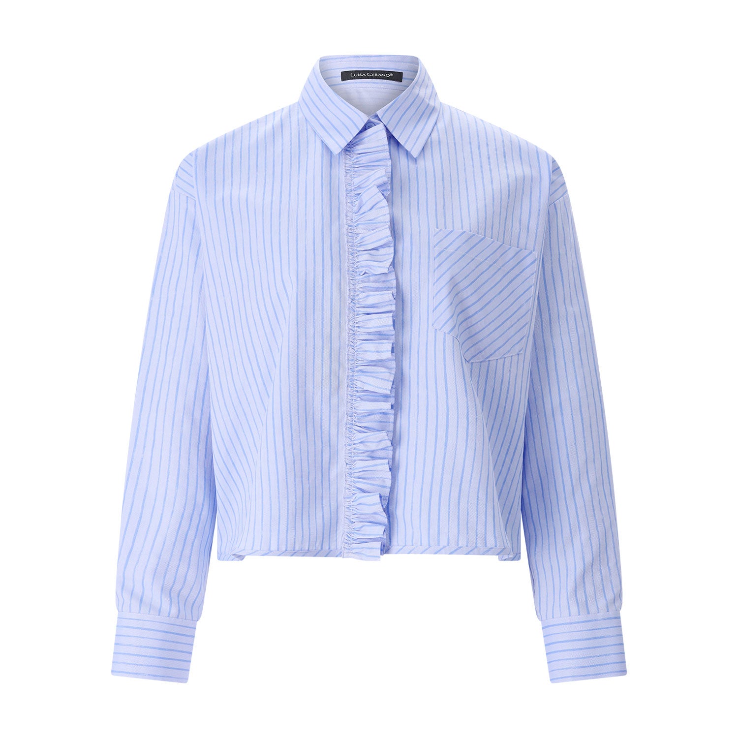 Ein modernes Update für den zeitlosen Streifen-Look: Diese Hemdbluse aus reiner Baumwolle besticht durch ihren kurzen, kastigen Schnitt, der für eine frische und luftige Silhouette sorgt. Das besondere Highlight ist die verspielte Rüsche entlang der verdeckten Knopfleiste, die dem maskulinen Streifen-Dessin eine feminine Note verleiht. Hochwertige Details wie die edlen Perlmuttknöpfe und die klassische Rückenfalte unterstreichen die exzellente Verarbeitung dieses vielseitigen Key-Pieces.
