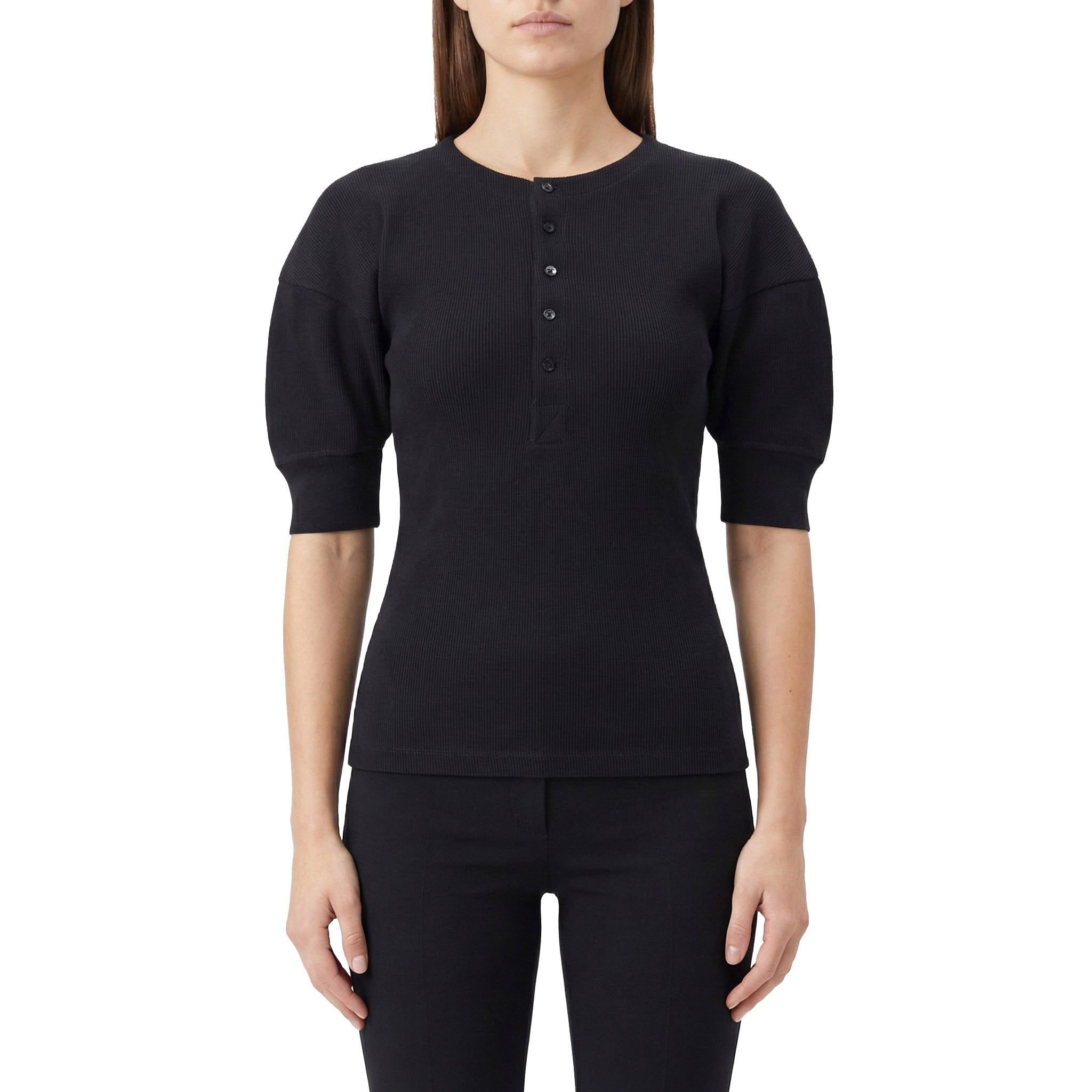 Dieses figurbetonte Shirt vereint feminine Details mit nachhaltiger Qualität. Gefertigt aus weicher, gerippter Bio-Baumwolle und hergestellt in Portugal, überzeugt es durch hohen Tragekomfort und eine perfekte Passform. Die eleganten Ballonärmel setzen modische Akzente, während der Rundhalsausschnitt mit feiner Knopfleiste dem Look eine charmante Note verleiht.