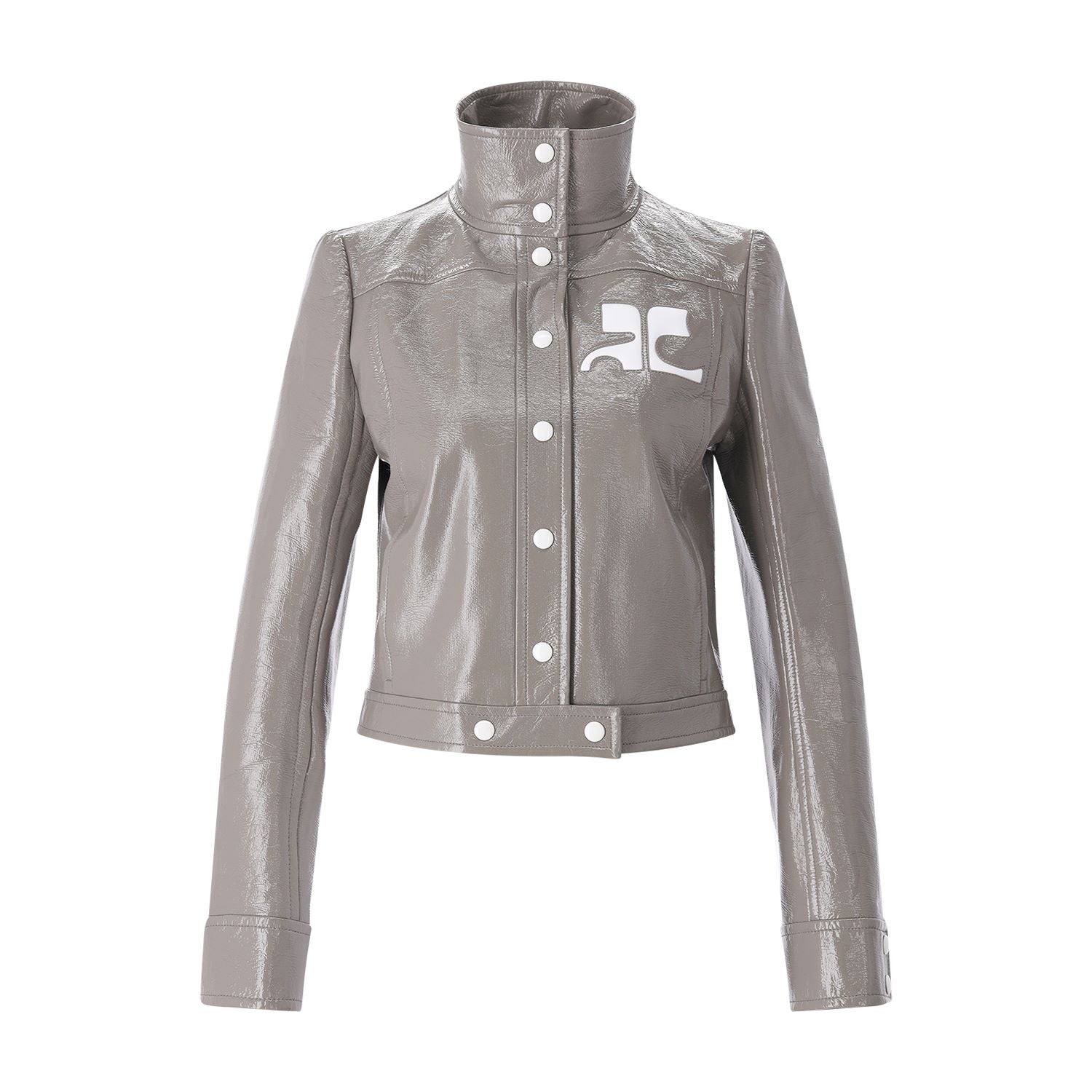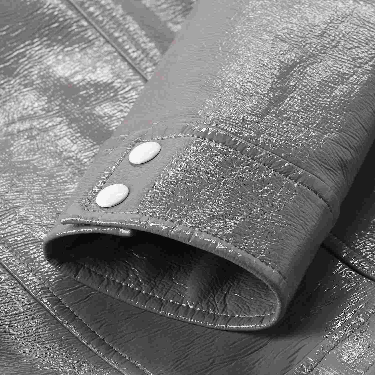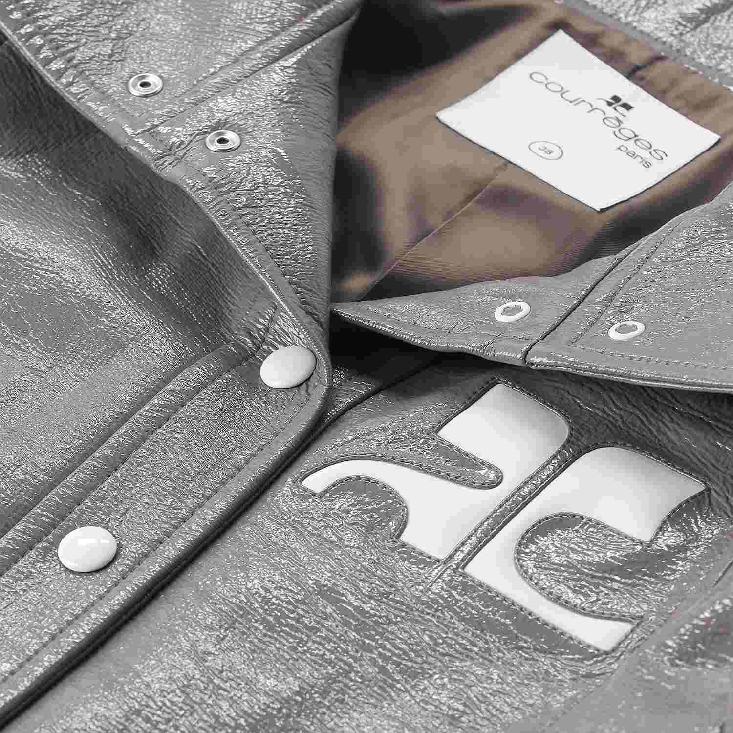 Diese Jacke ist ein ausdrucksstarkes Statement-Piece, das durch Materialität und präzise Schnittführung besticht. Gefertigt aus hochwertigem lackiertem Leder, besticht sie durch einen dezenten Glanz, der dem Design eine moderne, luxuriöse Tiefe verleiht. Ein besonderer Fokus liegt auf dem sorgfältig geformten Kragen, der der Jacke eine klare Struktur und eine souveräne Ausstrahlung verleiht. Das visuelle Highlight ist das große, weiße Logo auf der Brust, das einen markanten Kontrast zur glänzenden Oberfläche bildet.
